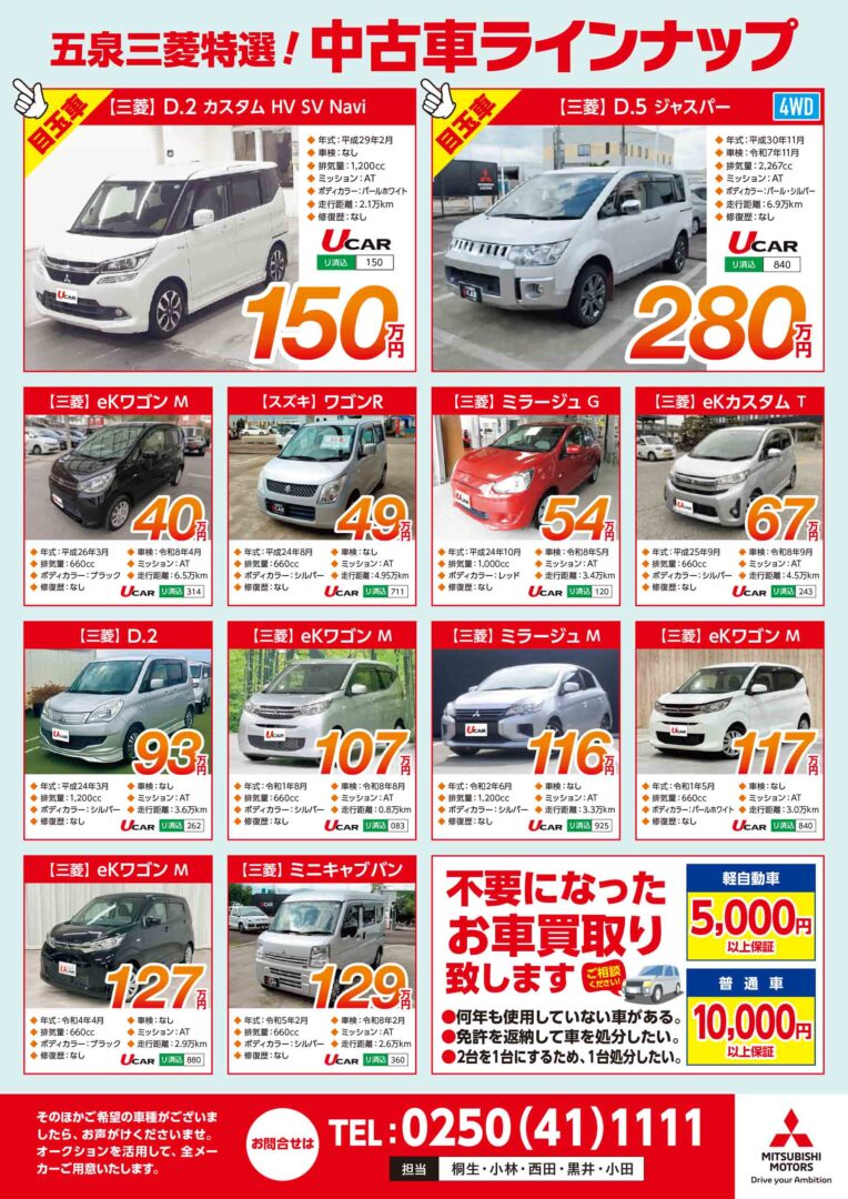 チラシには今販売中の中古車情報も掲載されております!中古車は早いもの勝ちなので、気になるお車ありましたらお気軽に当店までご連絡ください。